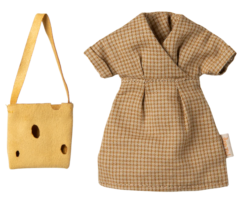 Mum mouse in light brown body fabric. She wears a dress and a bag with cheese holes. This mouse fits furniture and accessories in size mouse. Buy more clothes separately, clothes in size mum/dad fits this mouse.