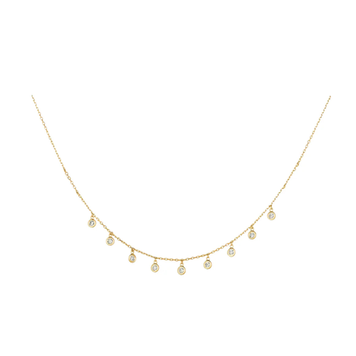 Made from 1mm diamond-cut bead chain, this 14-karat yellow gold necklace features nine bezel-set 2.7-pt. (1.9mm) round white diamonds (I-I2 clarity/H-I color; 25 pts. TW). A 2" textured cable chain extender allows customers to adjust the necklace's length.