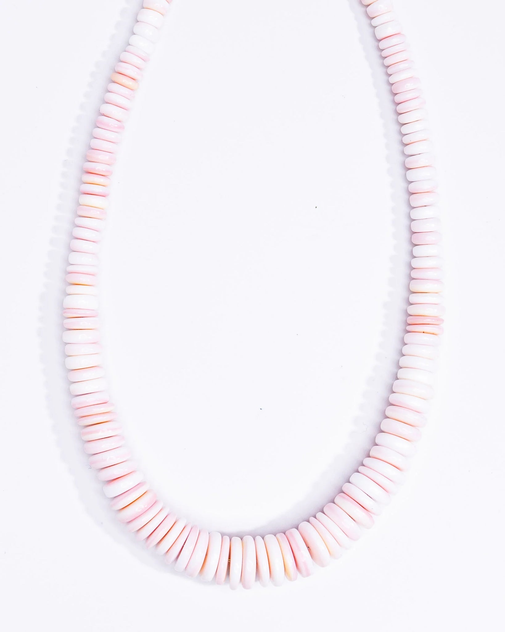 Graduated pink conch beads. Measures 18” long.