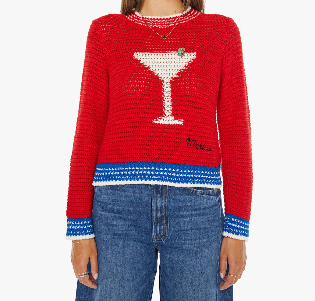 Cheers. A shrunken crewneck sweater with long sleeves and a cropped fit. Made from 100% cotton, Bottoms Up is a bright red with blue and white trim and a martini glass in white on the front.