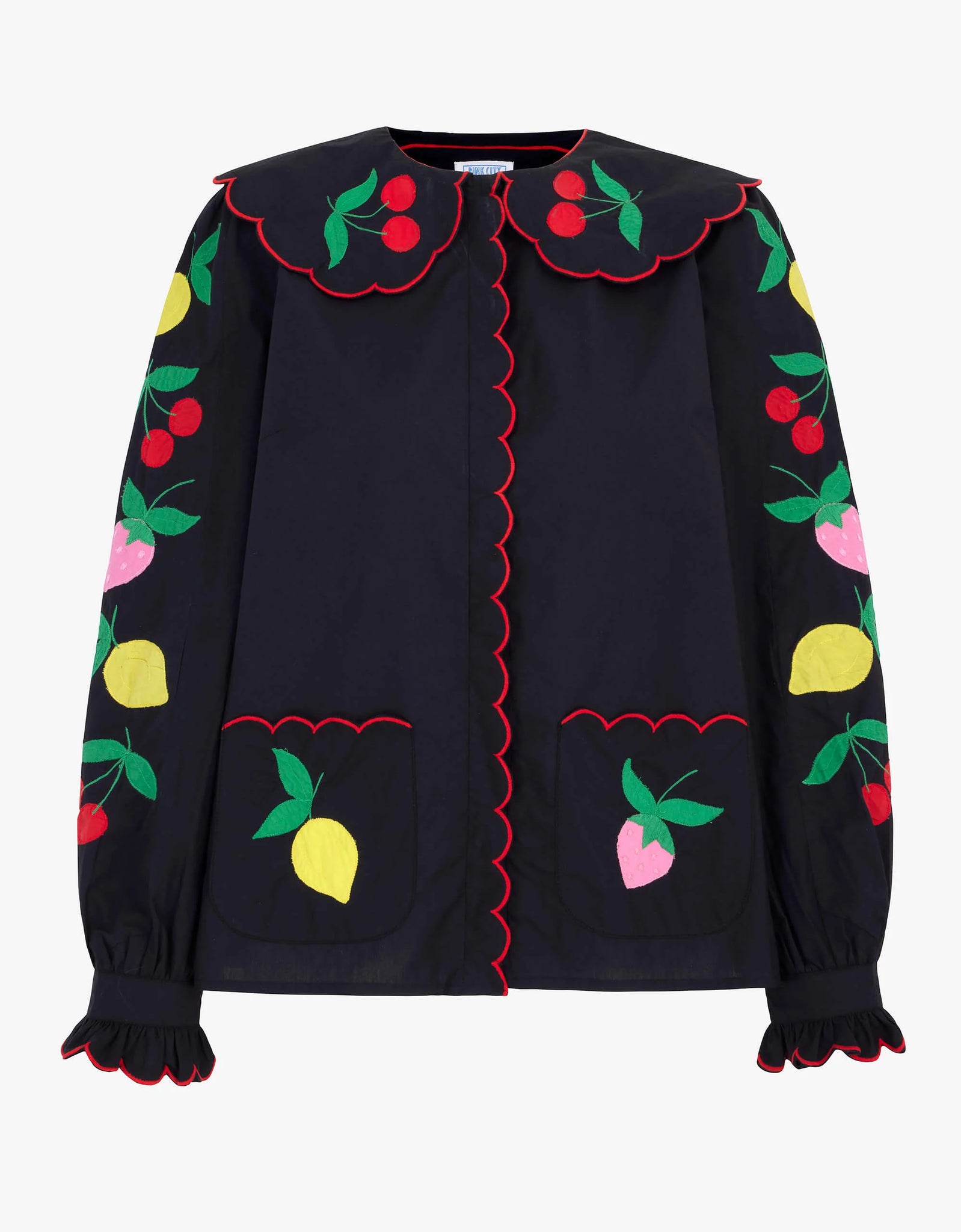 Make a statement with our delicious Feeling Fruity Apple blouse. Complete with playful, appliqué embroidery fruits at the collar, sleeves and pockets, the Apple blouse is truly good enough to eat! We love the red scallop finishing set against rich, black cotton poplin. Pair with the matching Ava shorts for a co-ordinated look or throw on with jeans for everyday wear.