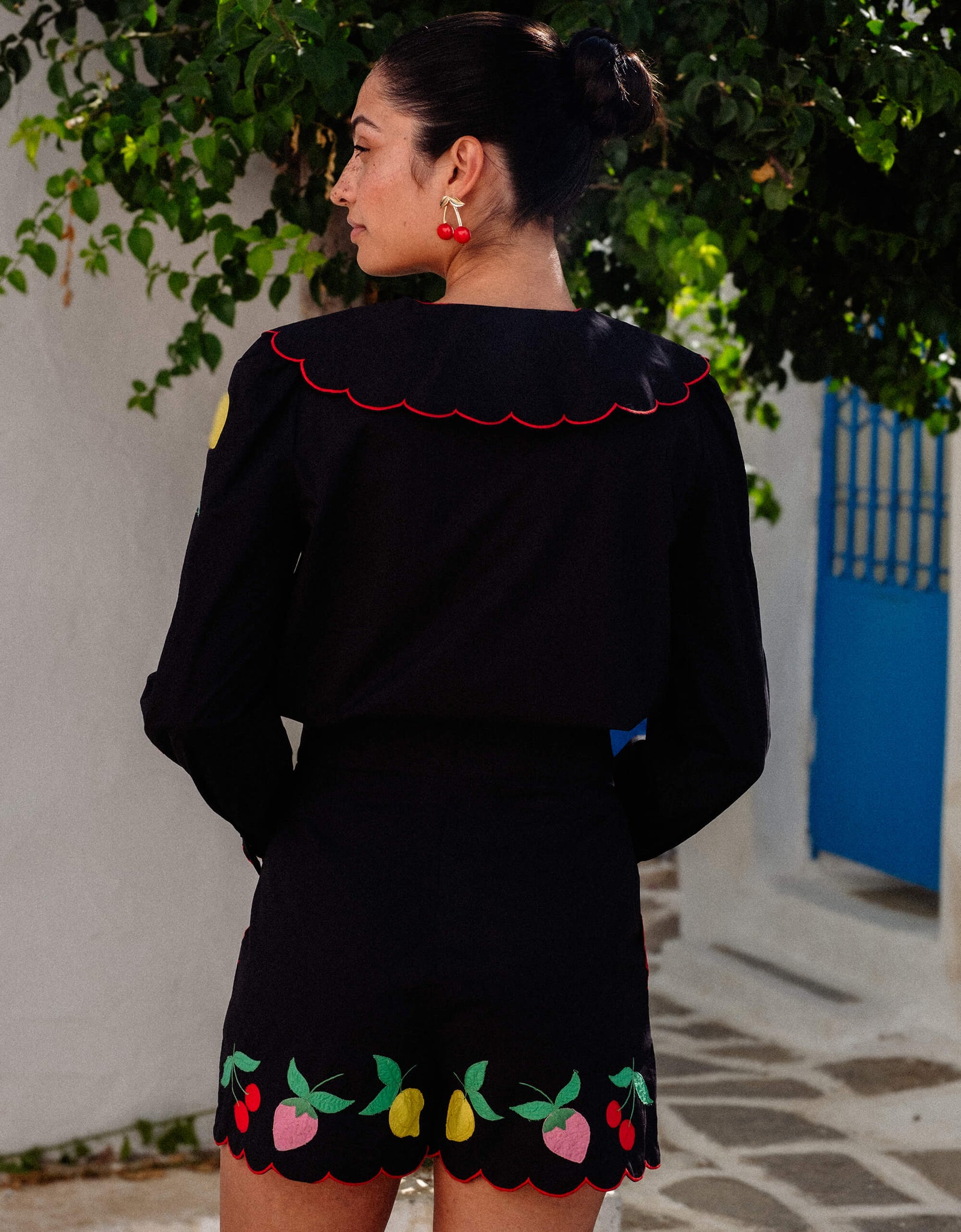 Designed to add a little fun to your wardrobe, our Feeling Fruity Ava shorts are good enough to eat! Complete with joyful, fruit appliqué embroidery sweeping across the hem, the Ava shorts have a flattering, high waisted fit and intricate red scallops to finish. Pair with the matching Apple blouse for a statement look, or style with a color-block jumper for an effortless combination.