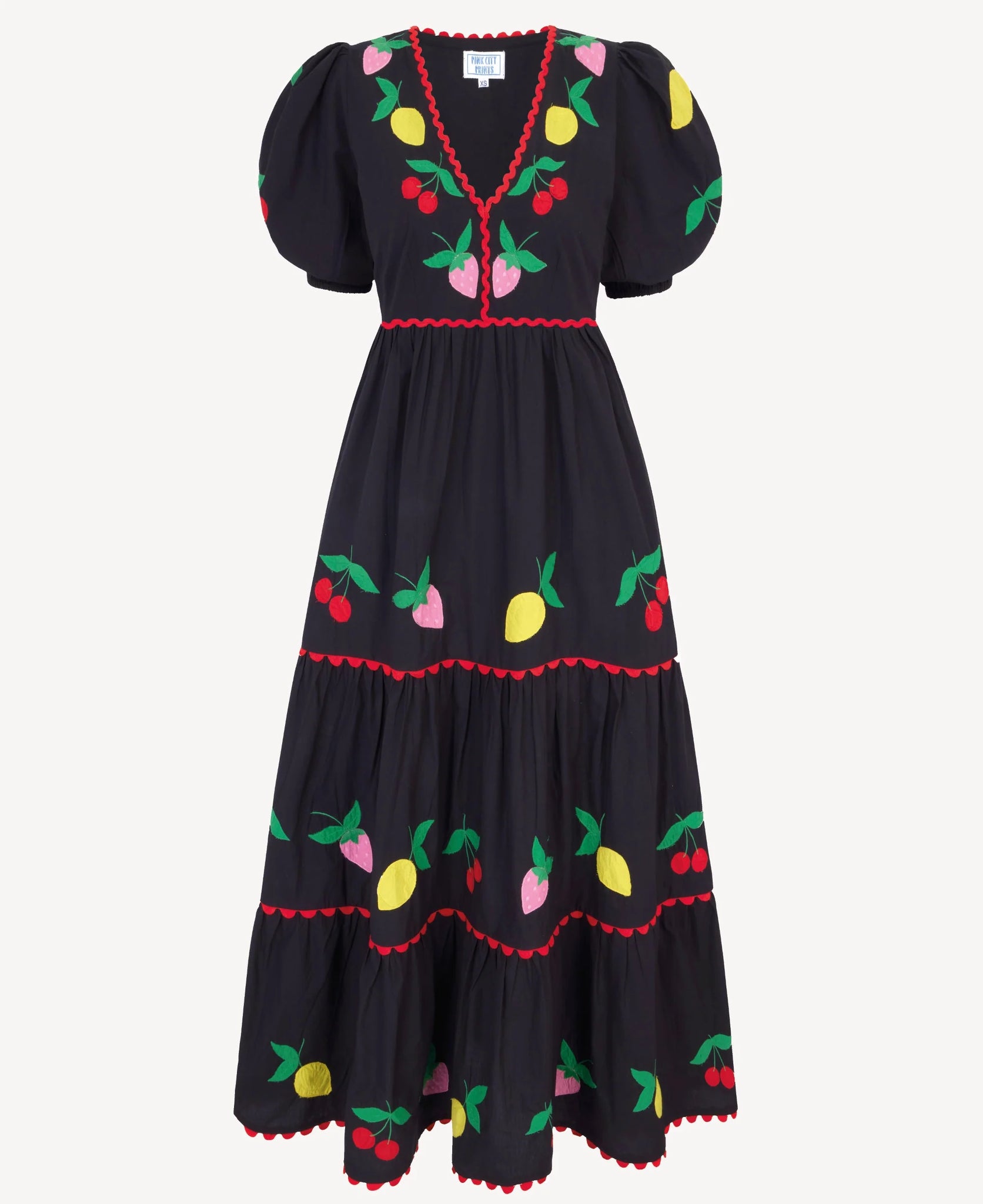 Make a statement with our delicious Feeling Fruity Jolie dress. Complete with playful, appliqué embroidery fruits throughout, the Jolie dress is truly good enough to eat! We love the red ric-rac trim that accentuates your waist. Finished with a flattering, V-neckline, easy tiered skirt and gathered short sleeves. Style with black boots and tights for cooler days, or dress up on holiday with gold jewelry and red Mary Janes. A showstopper piece you’ll treasure.