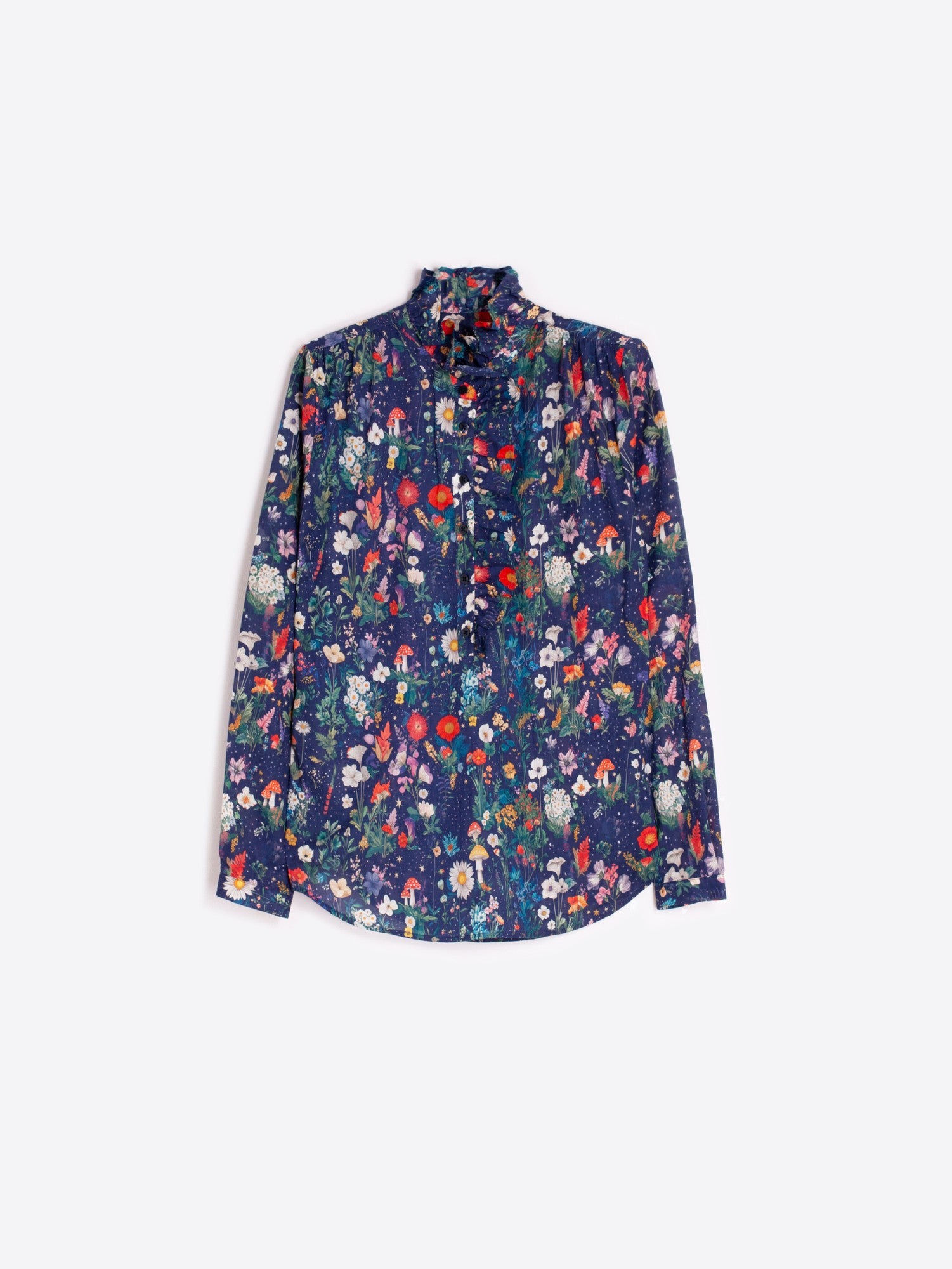 Blue blouse with multicolor floral print. High ruffled collar. Front button placket finished with a ruffle. Long sleeves with buttoned cuffs. Straight hem. Lightweight voile fabric in 100% cotton, soft and breathable.